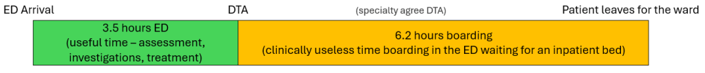 The average medical admission from the ED in our study took 3.5 hours to Decision To Admit (DTA) and spent 9.7 hours in the ED altogether.
