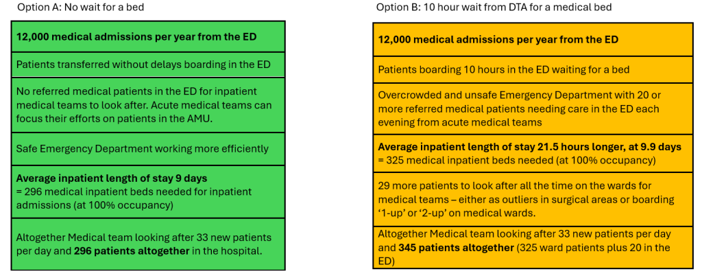 Boarding delays in the ED awaiting a medical bed mean patients spend significantly longer on the wards. Stopping ED boarding will reduce the amount of boarding that happens on the wards. This is not a ‘zero-sum’ situation in which harm and crowding are inevitable – we can manage the patients we currently look after in a much more efficient and compassionate way. Permanent backlogs are a sign of a lack of organisation and operational discipline. - c) Isn’t it safer to keep all the excess patients in one place? (the Emergency Department)