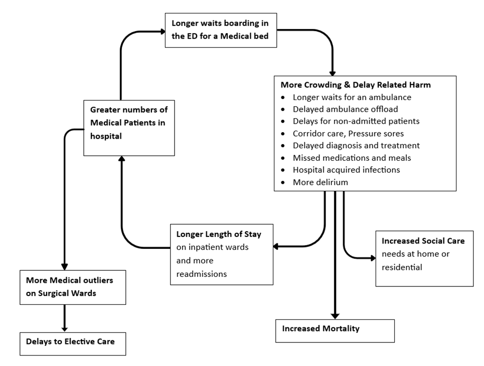It all starts with boarding delay in the ED awaiting a medical bed, that harm worsens outcomes, length of stay and the ability of the hospital to function effectively across all its domains. We really are shooting ourselves in the foot.