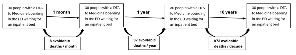 Our paper showed 56% of medical patients waited more than 4 hours from DTA for a bed, and that this delayed group had a number needed to harm (NNH – mortality) of 69. In other words, for every 69 patients boarding more than 4 hours, 1 additional death will occur.